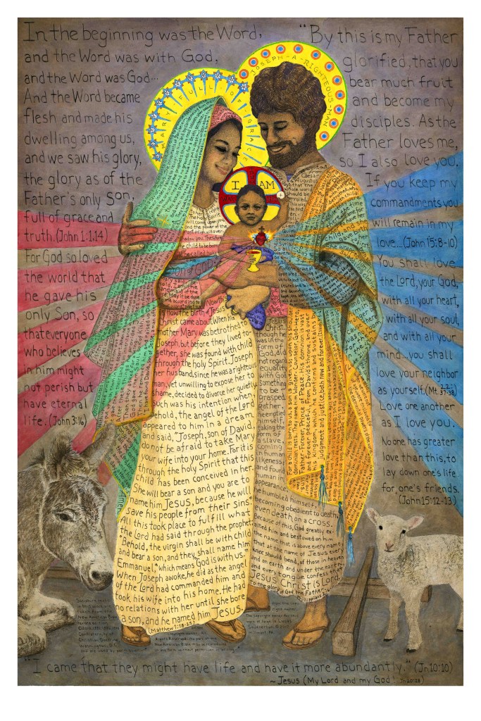 I took inspiration for this project from various religious, historical, and cultural sources. It was important to me that Jesus, Mary and Joseph looked Middle Eastern. The concept of including the scripture texts as part of the art work was inspired by Islamic calligraphy, and the specific texts were chosen from among the various passages read during the Catholic liturgy throughout the Christmas season. My intention when selecting the texts was evangelical. I want the reader to hear not only the Christmas story, but the entire story of salvation history. Jesus, Mary, and Joseph also contain several marks of iconography similar to those found in other artistic works throughout the ages of Christianity.