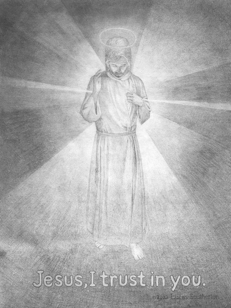 Jesus is shown giving us the sign of peace. In his hands are the elements of the Eucharist—his body and blood under the appearance of bread and wine. His chest contains his most sacred heart, pierced and burning with love for mankind. Radiating from it are rays of red and blue light which signify the blood and water which flowed from his side on the cross. The Christ Child’s face is designed to capture the apparent duality of his nature—that of an all-powerful God, and that of a vulnerable baby boy—that of one who demands satisfaction for our sins, and at the same time offers infinite mercy. It’s only by his cross (seen on the ground in the background) that this apparent duality is reconciled. God’s nature is one of infinite and sacrificial love. Jesus is our servant-king who calls each one of us to himself. My hope is that each person who views this image will feel that call more strongly and respond to it so that they might receive the grace needed to love the Lord our God with all their heart, with all their soul, and with all their mind. Jesus came that we might have life, and have it to the fullest! Amen!