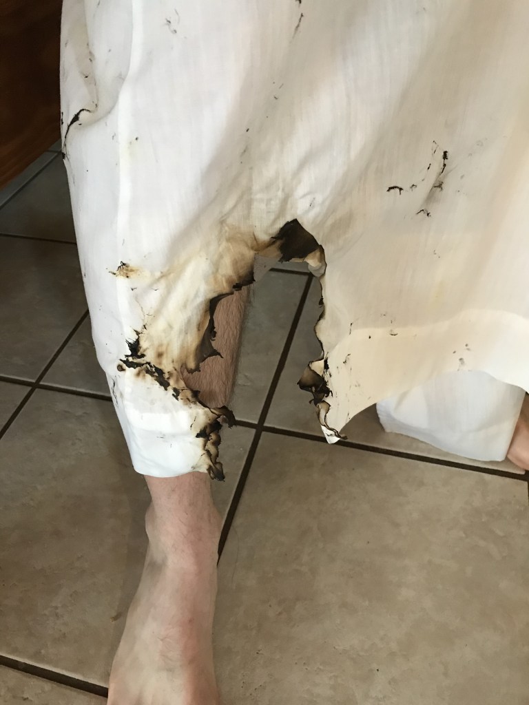 There wasn’t room to stop-drop-and-roll, so I just smacked out the flame with my hand! All in the name of created good art!