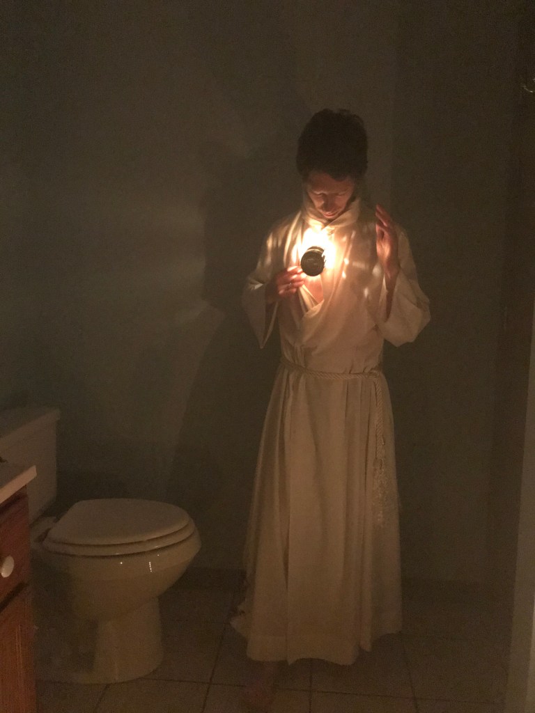 This is the image I referenced to make the sketch. It’s kind of embarrassing to use myself as a Jesus model but I’m the cheapest model I could find haha. I went the bathroom, which is the only dark room in the house during the day, and I lit a few candles on the floor to create a gentle light. I had a magnesium flame in a tin can with slit in it to create the appearance of light coming from the heart. I ran a smoke machine in the hopes that the can would create the appearance of rays of light. While messing with it, I caught my robe on fire because of the candles on the floor!
